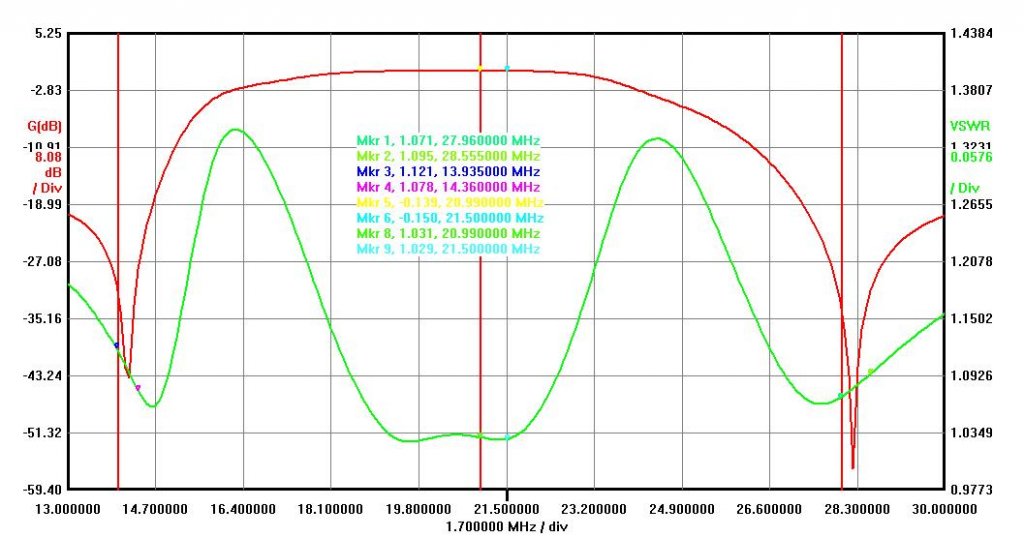 The LC trap resonances are very sharp for 15M band and there is not too much room to play with those LC traps to improve SWR as it was with other bands. You should set -30dB attenuation at 14Mhz and at 28MHz by LC traps adjustment.