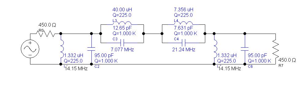 As a result of that transformation, I designed the BPF for 450 Ohm( 50 * 9 =450). For 40 and 15 meter band LC traps the required values should be recalculated, multiplying by 9 a capacitor values and dividing by 9 inductance values.