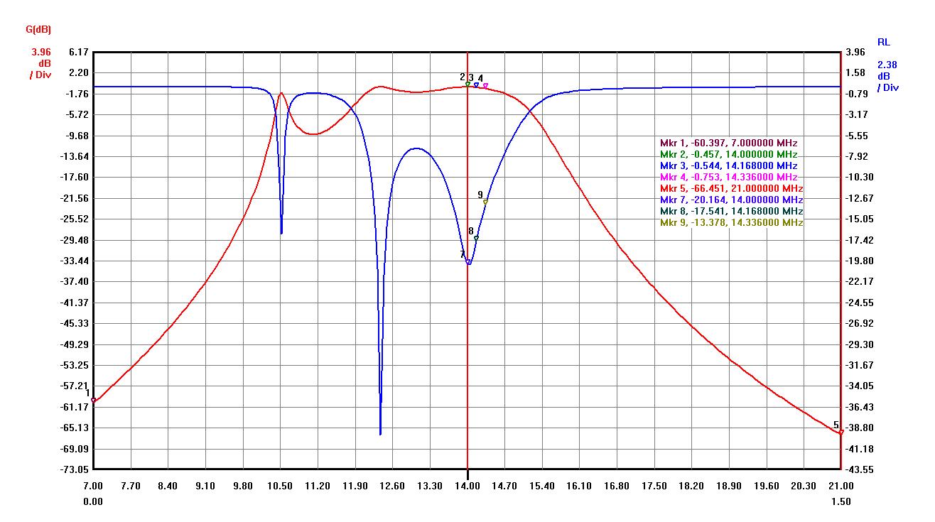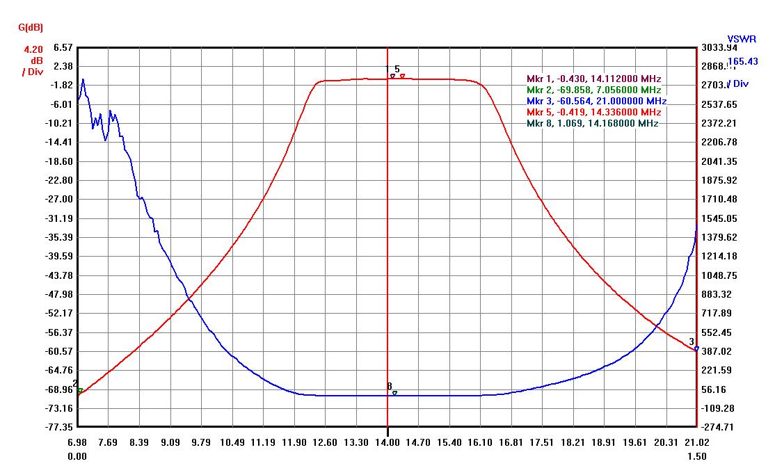 Please, see below two graphs, band attenuation and SWR/Return Loss.